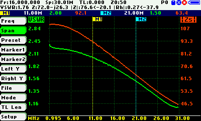 Вот входной КСВ драйвера, нагруженного на 10 Ом - см. зелёный трек.