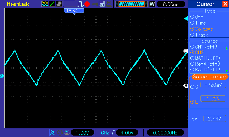 Решил посмотреть ток по первичке. Взял три 6,8 Ом МЛТ-1 в параллель и снял осциллограмму.